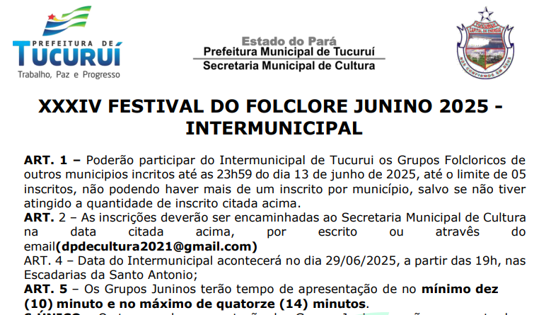 A Secretaria Municipal de Cultura de Tucuruí convida grupos folclóricos para participar do XXXIV Festival do Folclore Junino, que acontecerá no dia 29 de junho de 2025, a partir das 19h, nas Escadarias da Santo Antônio.