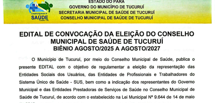 A Prefeitura de Tucuruí, por meio do Conselho Municipal de Saúde (CMS), torna público o Edital de Convocação para a eleição dos representantes do Conselho Municipal de Saúde, referente ao biênio agosto/2025 a agosto/2027.